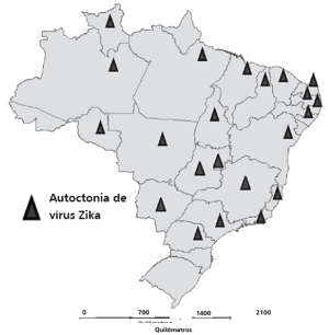 A figura a seguir representa as Unidades da Federação com casos autóctones de febre pelo vírus Zika com confirmação laboratorial até a Semana Epidemiológica 9, Brasil, 2016.