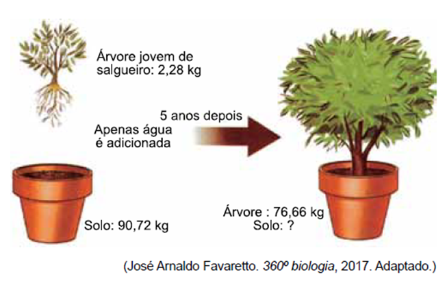 No experimento, Helmont plantou uma árvore jovem de salgueiro, de 2,28 kg, num vaso com 90,72 kg de terra. Após 5 anos, com hidratação contínua, a biomassa da árvore aumentou para 76,66 kg. Com base nos conhecimentos sobre fisiologia vegetal, a planta ganhou massa porque
