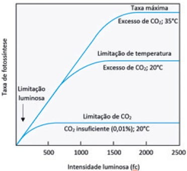 D) as limitações de CO2 e de temperatura são superadas quando há bastante luz.