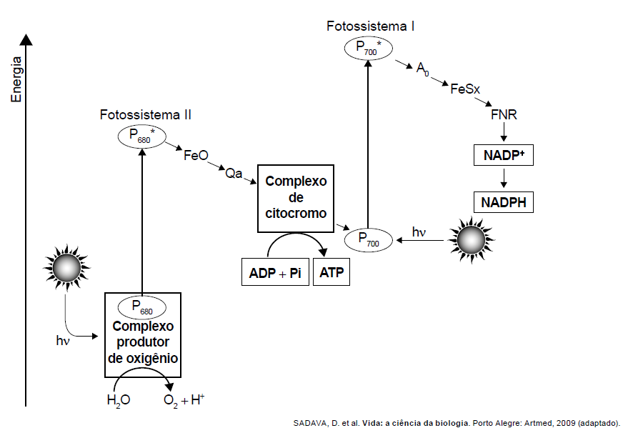 moléculas de clorofila a P680, no Fotossistema II, e de clorofila a P700, no Fotossistema I. Esses elétrons são responsáveis pelo mecanismo de fosforilação do ADP formando ATP e pela redução do NADP+ em NADPH.