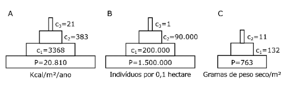 08) A figura C representa uma pirâmide de biomassa e mostra a quantidade de matéria orgânica presente no corpo dos seres vivos por unidade de área para cada um dos níveis tróficos.