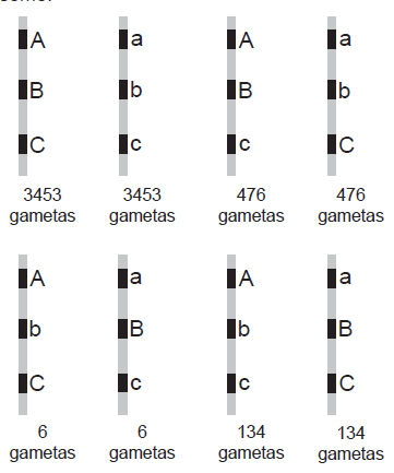 Os gametas ABC e abc estão em maior quantidade, o que indica que são os gametas parentais (não oriundos de crossing-over).