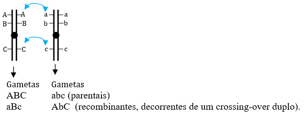 Agora, os gametas AbC e aBc são provenientes de uma dupla permuta, conforme mostrado abaixo.