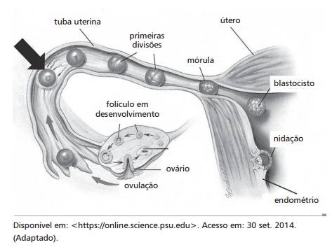 01) Em condições naturais, a fecundação ocorre no terço médio distal da tuba uterina (trompa de Falópio), próximo ao ovário.