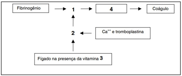 A protrombina transforma-se em trombina (1), que age sobre o fibrinogênio, originando a fibrina (4).