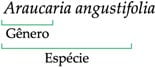 2) A nomenclatura é binomial, ou seja, todo ser vivo deve ter o seu nome científico com pelo menos duas palavras: a primeira para o gênero e a segunda para a espécie. No exemplo da Araucaria angustifolia (pinheiro-do-paraná), Araucaria é o nome do gênero e o conjunto dos dois nomes (Araucaria angustifolia) designa a espécie. É errado utilizar o segundo nome isoladamente.
