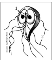 01) É um representante do grupo dos flagelados (mastigóforos), em que nº 1 corresponde à estrutura dos núcleos e o nº 2 corresponde aos