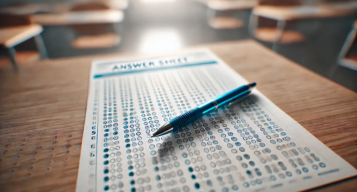 Imagem de um gabarito sobre uma mesa com caneta azul, ideal para trabalhos criativos e técnicos.