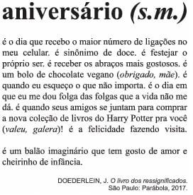02) No texto de João Doederlein observa-se a preocupação no uso de palavras e na composição do discurso, típica de escritores que utilizam as redes sociais para disseminar uma produção autoral, moderna e diferente dos princípios mais comuns a essas plataformas digitais. Assim, nessa simulação de verbete de dicionário, a função metalinguística dá espaço à incorporação da poética, como exemplificado pela expressão “é a felicidade fazendo visita”, mencionada na opção [C].