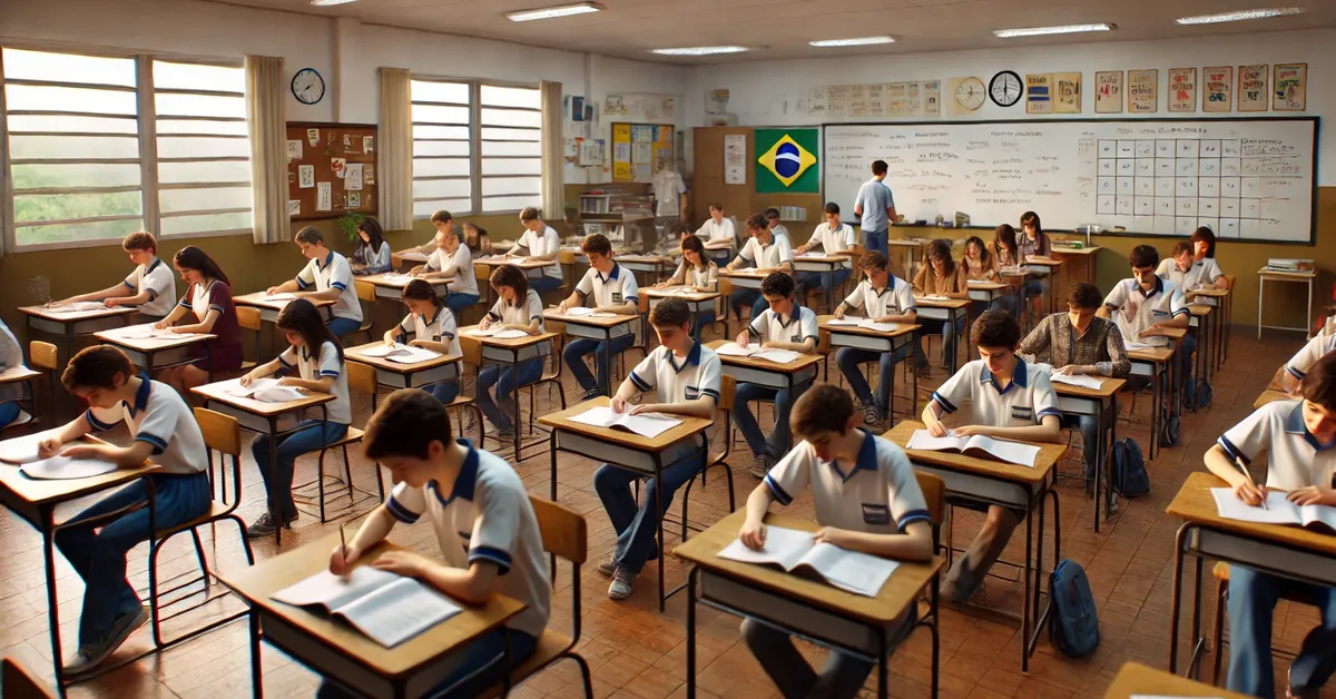 Alunos em uma sala de aula iluminada por luz natural, focados em seus exercícios.