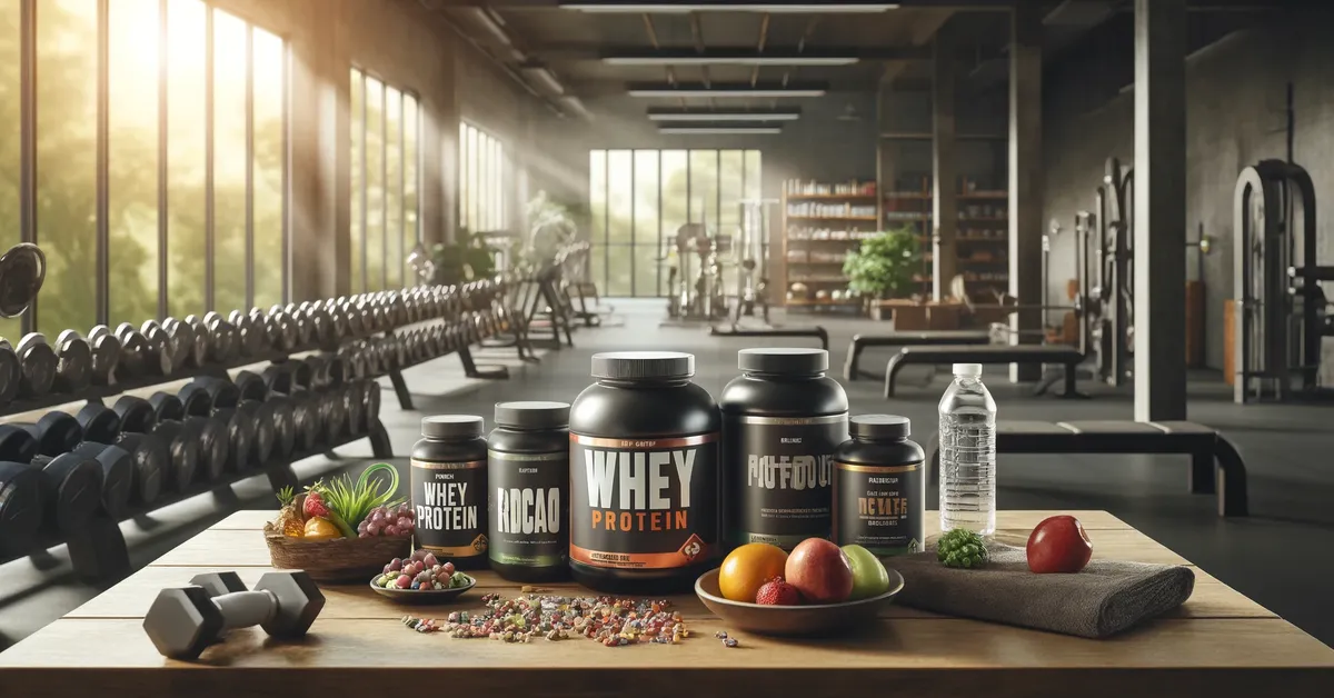 Imagem mostrando suplementos fitness, incluindo whey protein, em um banco de academia moderno.